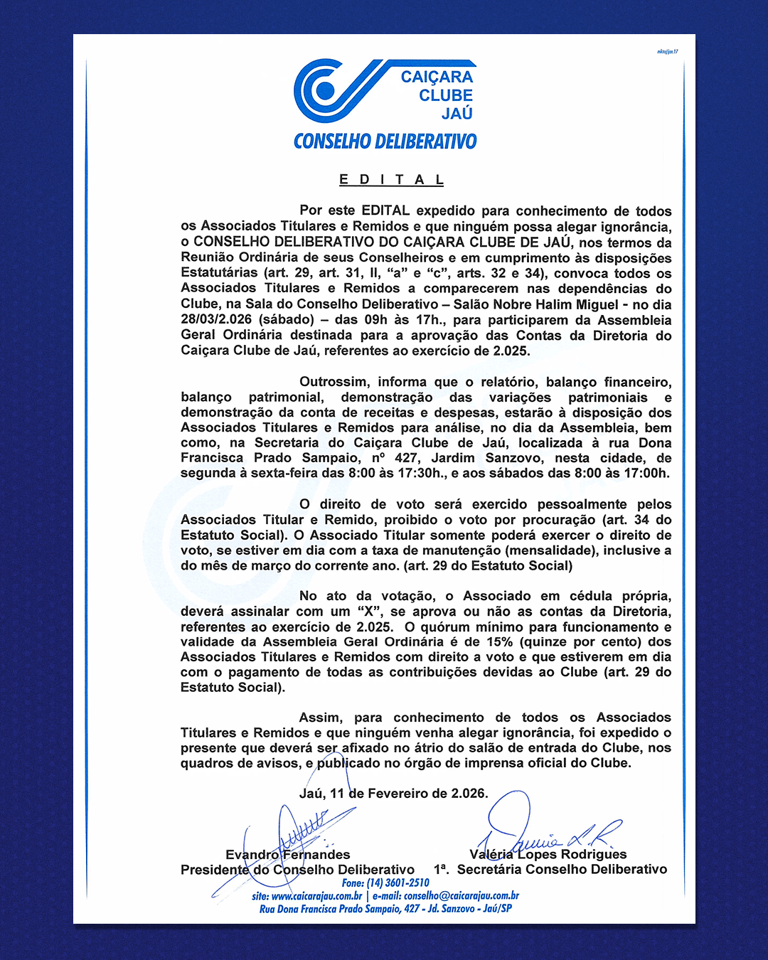 No dia 28 de março de 2026, das 9h às 17h, acontece a Assembleia Geral Ordinária para aprovação das contas do exercício de 2025 do Caiçara Clube de Jaú.